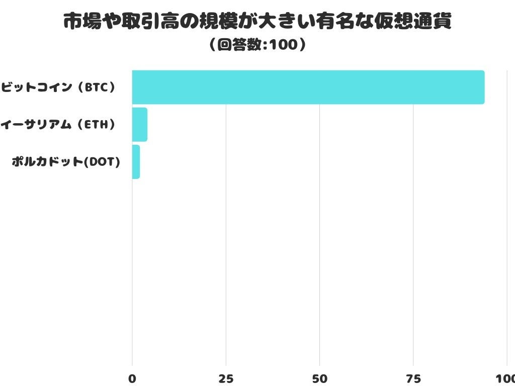 市場や取引高の規模が大きい有名な仮想通貨をアンケートにて調査したところ、1位は「ビットコイン(BTC)」でした。