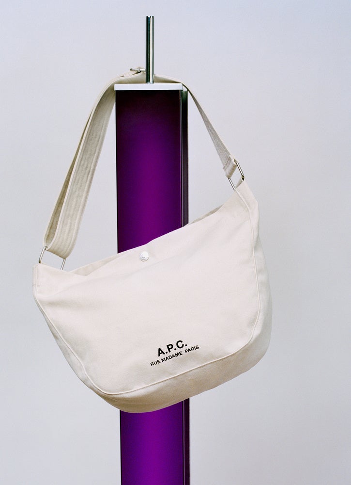 この新しいショルダーバッグスタイルは、フロントに2つの特徴的なA.P.C.スナップボタンをあしらい、ミリタリーディテールを感じさせ、実用性とスタイルを両立させたデザインです。