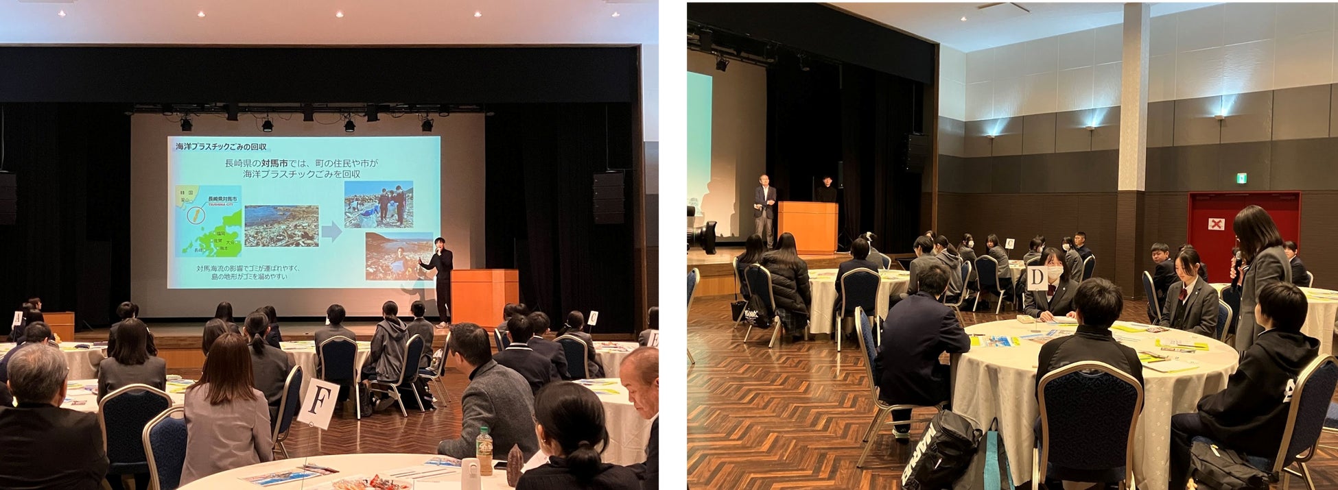 今回のシンポジウムには、日頃から清掃活動などのボランティア活動をしている県内の高校生を中心に、32人が参加しました。三菱鉛筆が取組む、海洋プラスチックを使ったジェットストリーム(ボールペン)を製作する過程や素材循環にまつわるストーリーや、県内の企業が学校が取り組んでいる事例の紹介を通じ、「ごみ拾い」だけではない「海ごみゼロ」への道を学び・考えました。基調講演の後には、高校生から鋭い質問があったり積極的に話を聞きに行く姿も見受けられ、環境問題に対する高い関心と主体性がうかがえました。