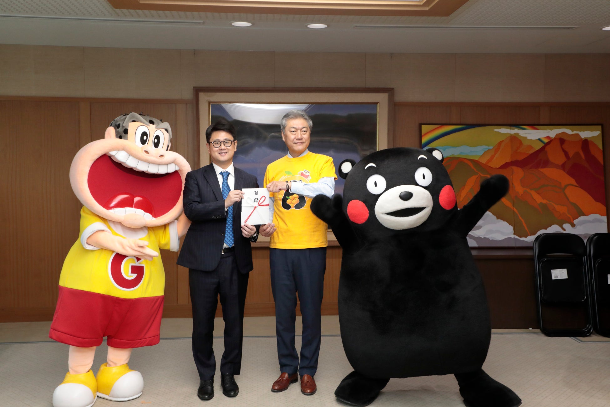 熊本県庁で行われた贈呈式では、熊本県知事公室長深川元樹様、くまモン、ガリガリ君出席のもと、赤城乳業から災害復興支援として売り上げの一部を熊本県へ贈呈いたしました。