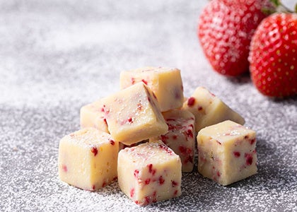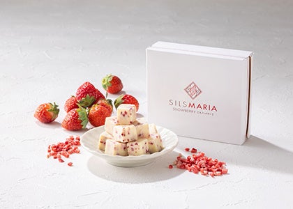 今回の宿泊プランの特典としてご用意する「スノーベリー」は、生チョコレート発祥の店として知られているシルスマリアの定番商品の1つです。ベルギー産ホワイトチョコ&クリームの生チョコにフリーズドライの苺が混ぜ込まれ、柔らかな口溶けと風味豊かなミルク味にプチプチした食感と酸味が程よいアクセントになっています。