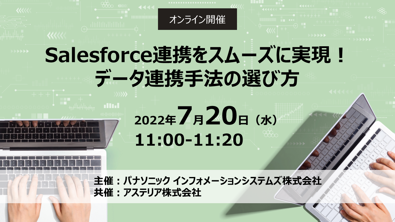 パナソニック インフォメーションシステムズ株式会社は、2022年7月20日(水)に『Salesforceとのデータ連携手法選定のコツ』にフォーカスしたオンラインセミナーを開催します。