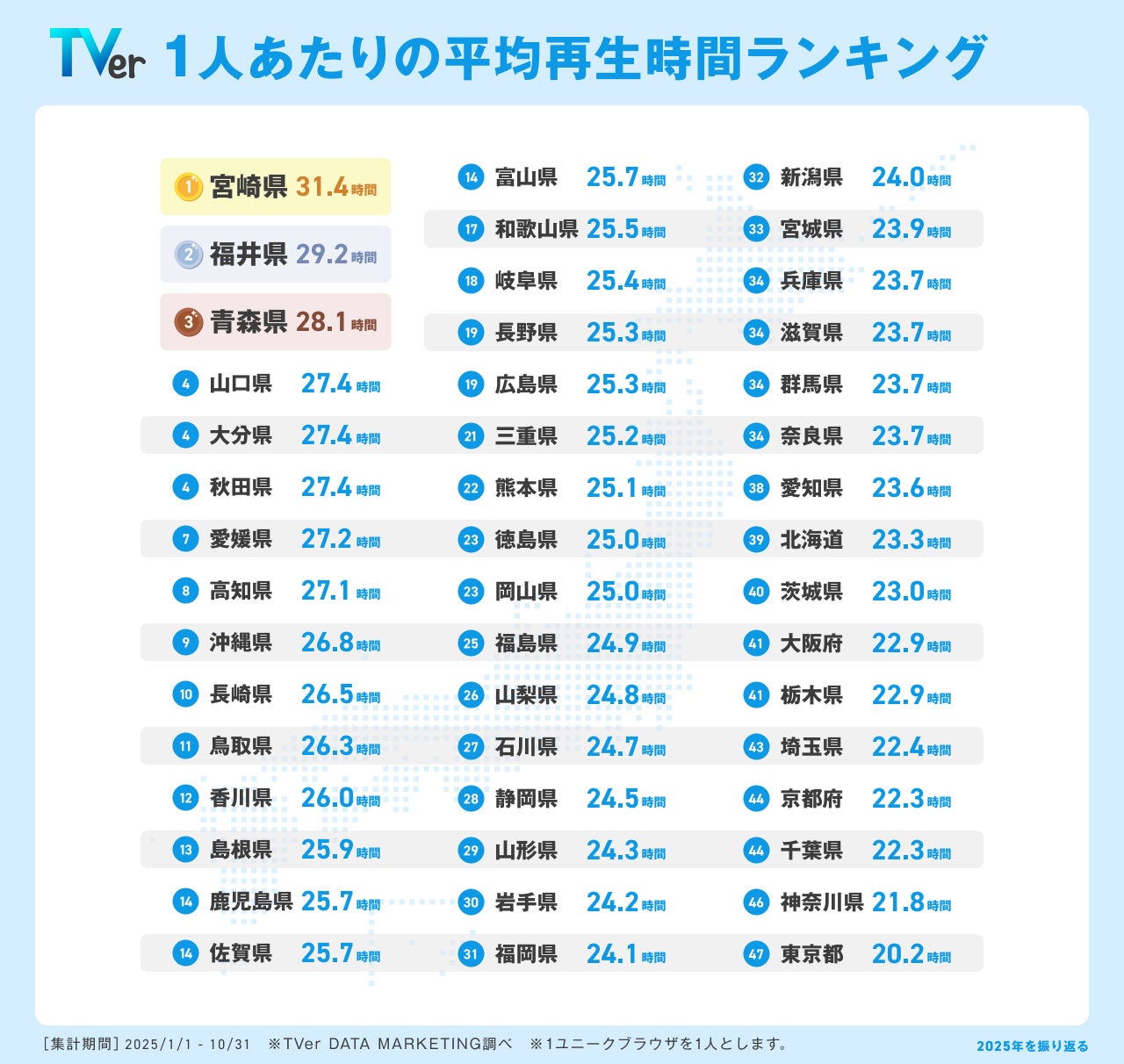 2025年1月1日から10月31日の集計における、1人(※4)あたりの平均再生時間(※5)は、2024年と同様に1位が宮崎県、2位が福井県となりました。上位を、複数の系列のネットワークに加盟しているクロスネット局のある県が占めたことから、居住地域の地上波放送では見られない番組もTVerを通じてお楽しみいただいている様子がうかがえます。