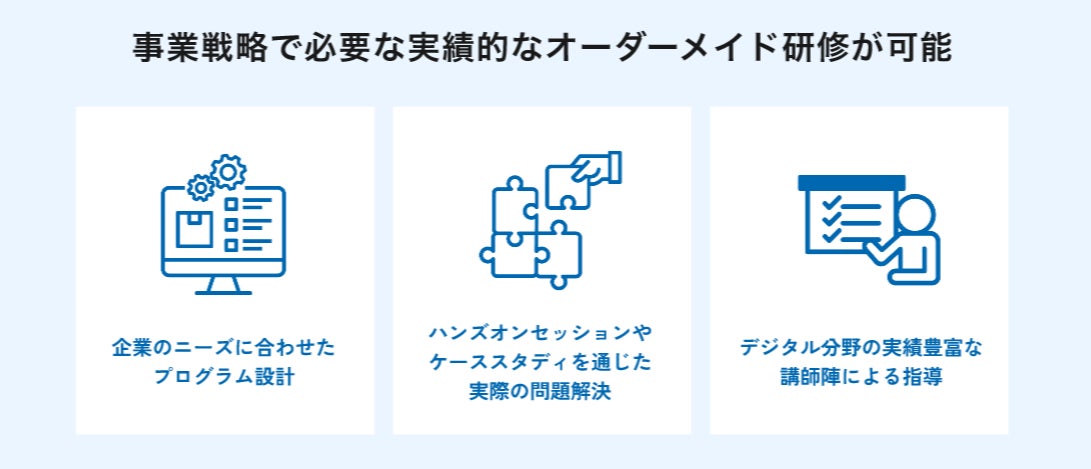 また、本研修は受講して終わりではなく「DXを自走できる組織を社内に作ること」を目標にしています。テクニカルな技術はもちろんですが、消費者のニーズを踏まえた企画力、プロジェクトを推進するためのマネジメント能力、問題解決力などのスキル習得も同時に支援します。受講者がDXに関わる知識や技術を確実に身につけ自走できるまでしっかりサポートします。
