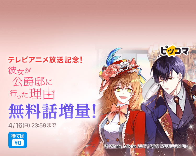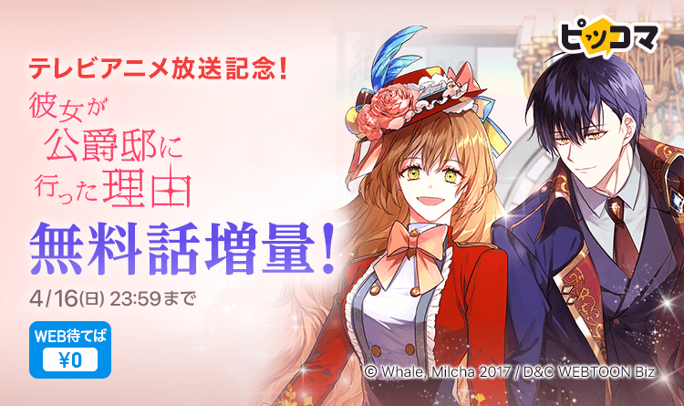 株式会社カカオピッコマ(本社:東京都港区、代表取締役社⻑:金在龍)の電子マンガ・ノベルサービス「ピッコマ」(https://piccoma.com/web/)では本日(4/10)よりテレビアニメが放送開始となる『彼女が公爵邸に行った理由』の放送開始を祝して無料話を4話から20話まで増量いたします。期間は4/10(月)から4/16(日)までです。