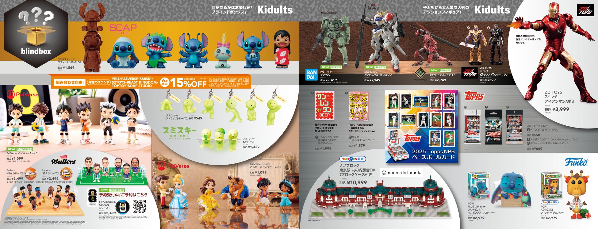 中でも開けるまでどれが出てくるかわからないミニチュアフィギュアの「ブラインドボックス」に関しては、国内外のメーカーの人気商品を豊富に取り揃えており、その数は約200種類に及び、よりワクワク感を駆り立てるラインアップになっております(※1)。今回対象の32店舗では「スミスキー」や「PalVerse(パルバース)」など人気の「ブラインドボックス」商品の品揃えを強化し、より身近にキダルト商品に出会えるようになります。
