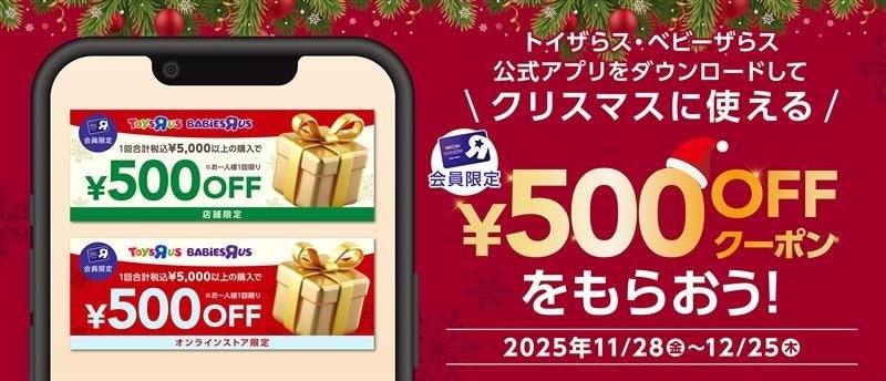 トイザらス・ベビーザらス公式アプリをダウンロードしている方に、もれなくクリスマスに使える500円OFFクーポンをプレゼント!