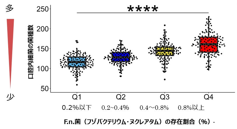 対象者611名の唾液を回収し、その中に存在する細菌由来の遺伝子情報をもとに口腔内細菌種を解析しました。さらに、F.n.菌の存在割合(%)に着目し、4つの分位(Q1<0.2%、0.2≦Q2<0.4、0.4%≦Q3<0.8%、0.8%≧Q4)に唾液を層別化し、それぞれに含まれる口腔内細菌の菌種数を解析しました(図1)。その結果、F.n.菌の存在割合が最も低い場合(Q1)に比べて、最も高い場合(Q4)では、有意に検出される口腔内細菌の菌種数が増加しました(p < 0.2)。