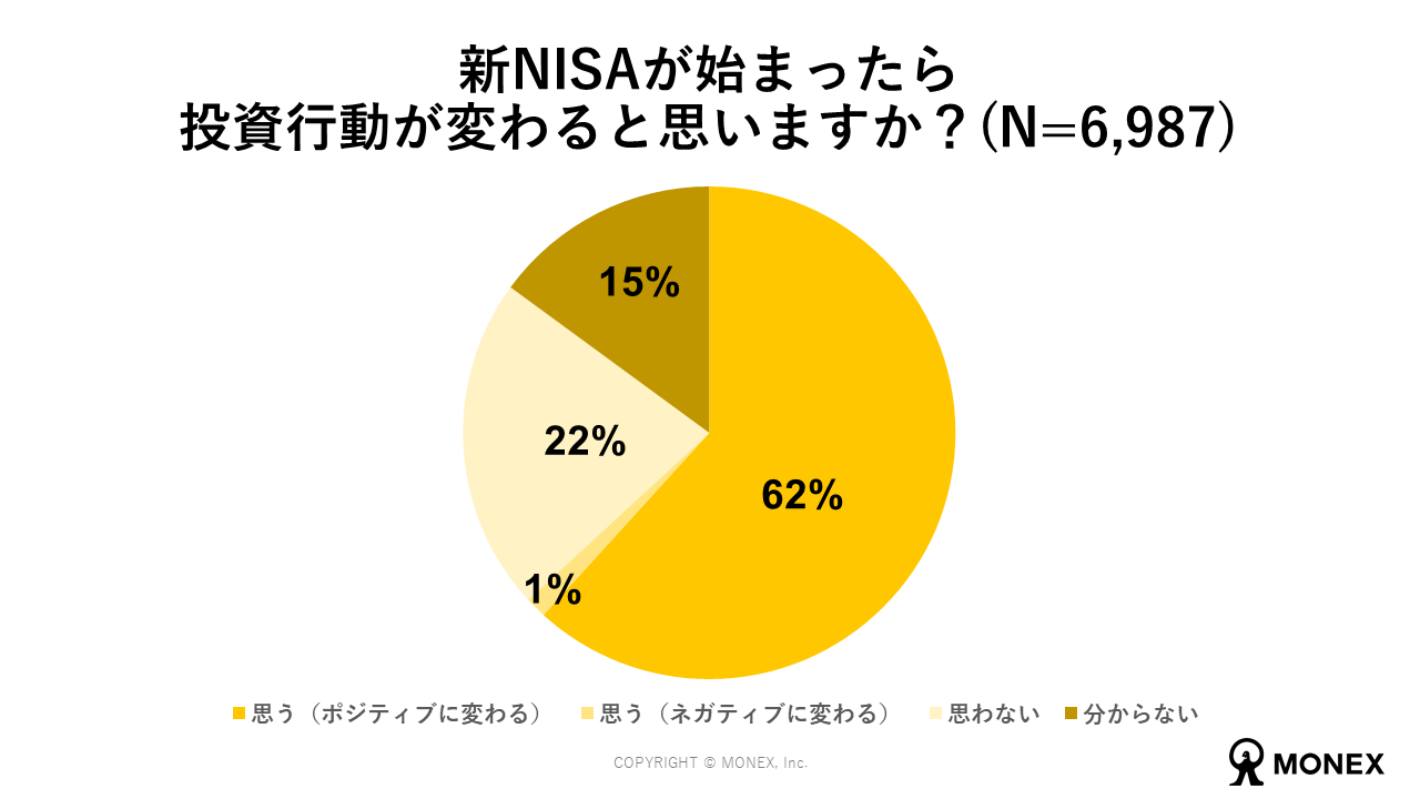 新NISAへの改正を受けて自分の投資行動がポジティブに変わると思っている個人投資家は62%となりました。ネガティブに変わると思っている個人投資家は今回の制度変更を評価できないと回答した個人投資家の割合とほぼ同じく1%にとどまっています。