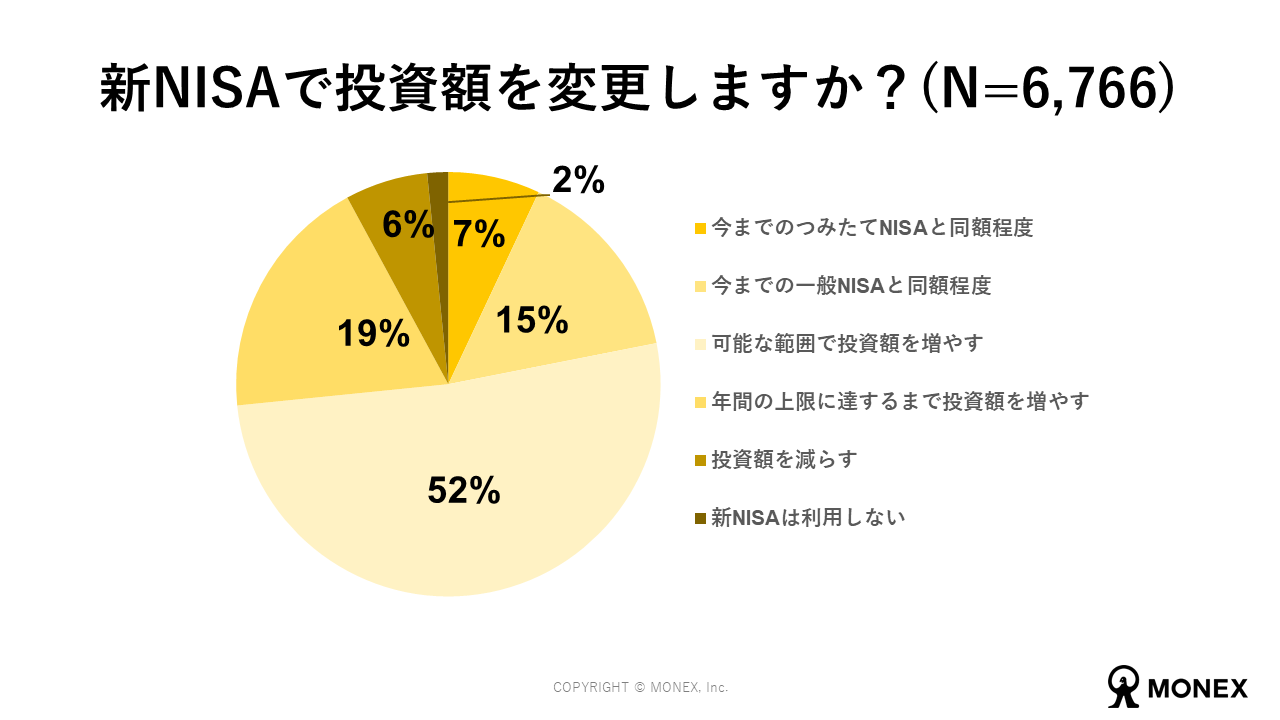 現行のNISAの口座を保有している個人投資家のうち、半数以上が新NISAへの変更後は可能な範囲で投資額を増やす想定をしていることが分かりました。年間の上限に達するまで増やすという個人投資家も合わせると実に71%もの個人投資家が増額を検討しているという結果となっています。