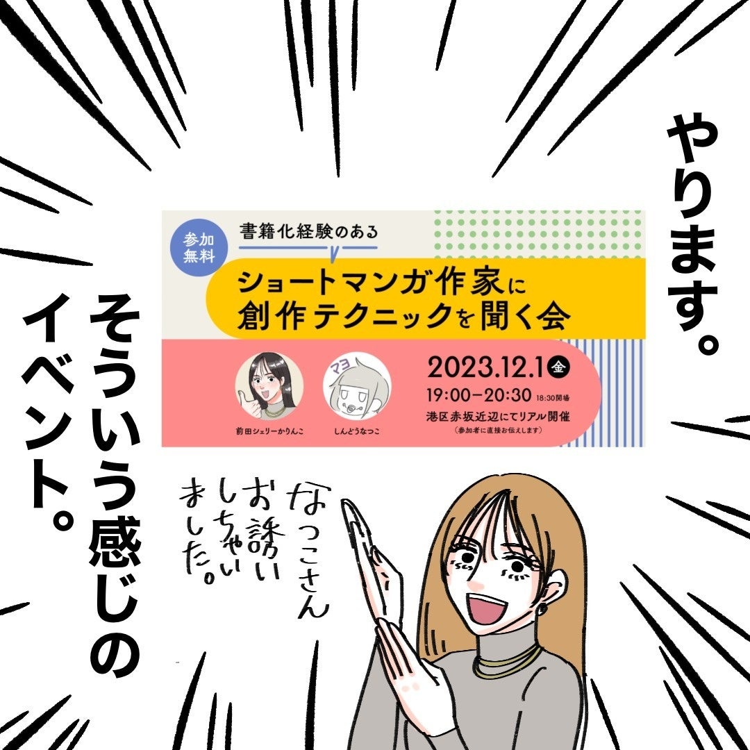 「書籍化経験のあるショートマンガ作家に創作テクニックを聞く会」は、衝撃の実話を元にマンガを描かれている、『メンヘラ製造機だった私が鼻にフォークを刺された話』の著者・前田シェリーかりんこさん、『3度目の浮気〜ゴミカス旦那よ、覚悟しろ〜』の著者・しんどうなつこさんをお招きし、「どんな道筋で書籍化に至ったのか?」「どのようにフォロワー数を増やしたか?」など、普段SNSには投稿できないような生々しいお話をお聞きするリアルトークイベントです。