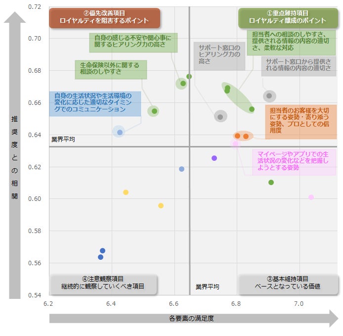 一方でロイヤルティ向上のために優先的に改善が期待される項目としては、担当者の「生命保険以外(資産形成・教育・老後など)に関する相談のしやすさ」や「自身の感じる不安や関心事に関するヒアリング力の高さ」、また「自身の生活状況や生活環境の変化に応じた適切なタイミングでのコミュニケーション」といった項目となりました。
