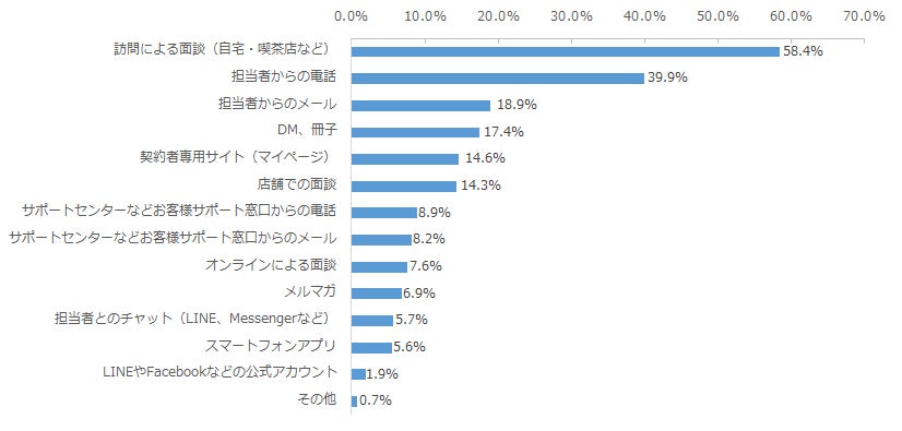 生命保険会社から受けたアフターフォローの手段について調査をしたところ、最も多いのは「担当者による訪問(自宅・喫茶店など)」(58.4%)となりました。次いで「担当者からの電話」(39.9%)、「担当者からのメール」(18.9%)と、担当者から受けるアフターフォローが続きました。また、デジタルの手段においては「契約者専用サイト(マイページ)」が14.6%、「スマートフォンアプリ」は5.6%、サポートセンターなどお客様窓口からのアフターフォローとしては「電話」が8.9%、「メール」8.2%となりました。