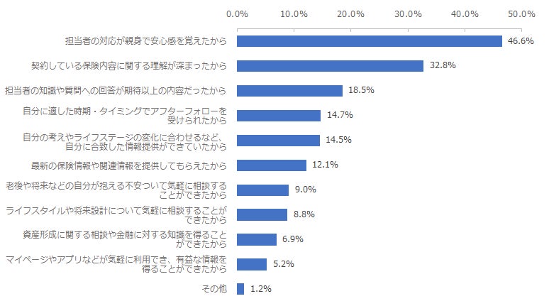 元々アフターフォローを希望していなかった一方で、アフターフォローを受けたことでその重要性などの価値を感じるようになった人に対し、その理由を調査したところ、最も高くなったのは「担当者の対応が親身で安心感を覚えたから」(46.6%)となりました。次いで「契約している保険内容に関する理解が深まったから」(32.8%)、「担当者の知識や質問への回答が期待以上の内容だったから」(18.5%)が続きました。