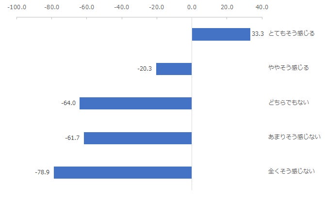 またサポートセンターやデジタルチャネルによるアフターフォローが、担当者から受けるアフターフォローと同じくらい役に立っていると感じるかという印象別にNPSも分析したところ、「とてもそう感じる」と回答した契約者のNPSは33.3、また「ややそう感じる」と回答した契約者も-20.3となり、それ以外の契約者に比較してNPSが高くなりました。