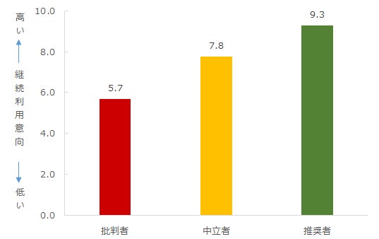 対象の生命保険会社におけるアフターフォローを受けての今後の継続利用意向を0~10の11段階でたずねたところ、「推奨者」(推奨度が「9」~「10」の回答者)は平均9.3、「中立者」(推奨度が「7」~「8」の回答者)は平均7.8、「批判者」(推奨度が「0」~「6」の回答者)は平均5.7となり、推奨度が高いほど継続利用意向も高くなりました。