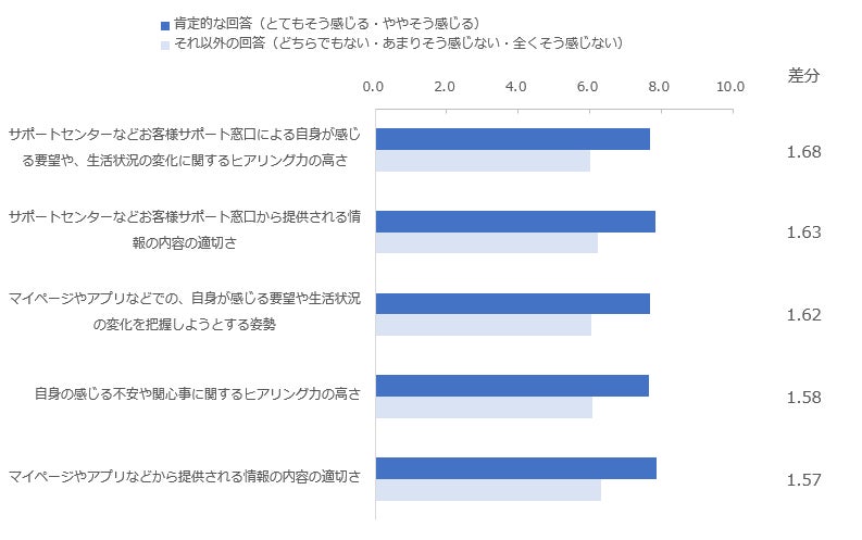 これらの印象別に満足度も比較したところ、肯定的(「とてもそう感じる」、「ややそう感じる」)な回答をした契約者とそれ以外の回答(「どちらでもない」、「あまりそう感じない」、「全くそう感じない」)をした契約者の満足度平均値の差分で最も大きくなったのは「サポートセンターなどお客様サポート窓口による自身が感じる要望や、生活状況の変化に関するヒアリング力の高さ」となりました。次いで「サポートセンターなどお客様サポート窓口から提供される情報の内容の適切さ」や「マイページやアプリなどでの、自身が感じる要望や生活状況の変化を把握しようとする姿勢」といった項目が続きました。