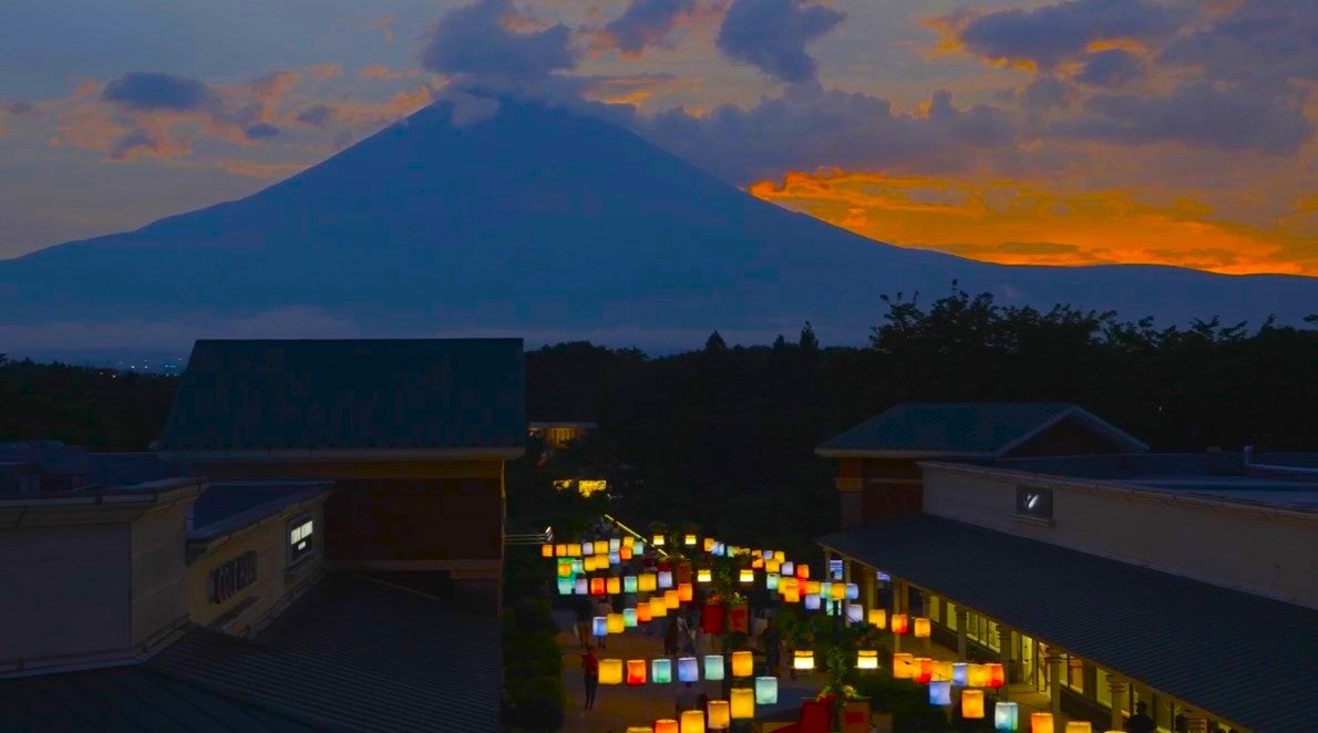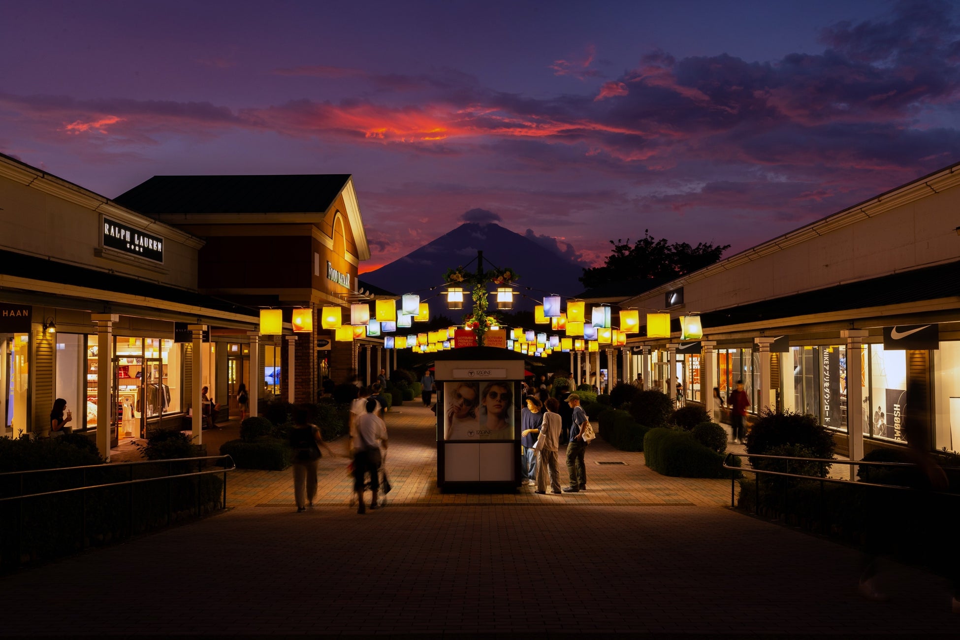18時を過ぎて徐々に陽が落ち始めると、カラフルなランタン装飾に明かりが灯ります。あいにくこの日は雲がかかっていましたが、晴れの日は、アウトレット内の夕暮れの富士山とランタンの優しい光が映えるフォトジェニックなスポットとして、絶景の記念撮影も楽しめます。