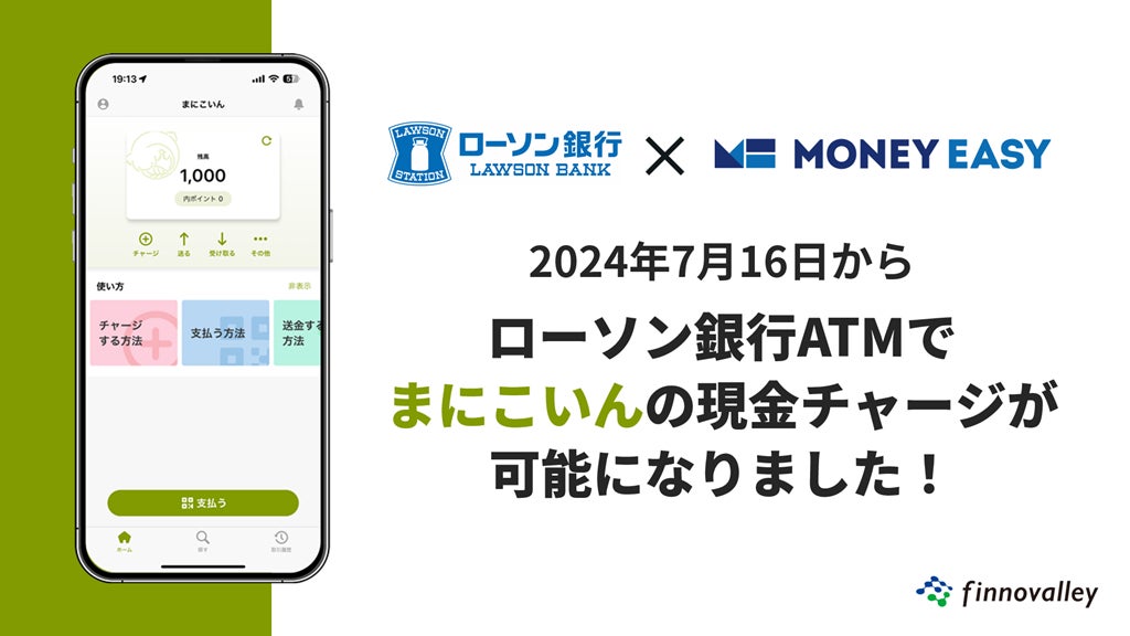 株式会社アイリッジ(本社:東京都港区、代表取締役社長:小田 健太郎、東京証券取引所グロース:3917、以下「アイリッジ」)の連結子会社でデジタル地域通貨事業を展開する株式会社フィノバレー(本社:東京都港区、代表取締役社長:川田 修平、以下「フィノバレー」)は、株式会社ローソン銀行(本社:東京都品川区、代表取締役社長: 鶴田 直樹、以下「ローソン銀行」)と連携し、フィノバレーが提供するデジタル地域通貨プラットフォーム「MoneyEasy」を採用したデジタル地域通貨へのローソン銀行ATMからの現金チャージが可能になりました。第1弾として、岡山県真庭市のデジタル地域通貨「まにこいん」が、2024年7月16日よりローソン銀行ATMからの現金チャージに対応することをお知らせします。