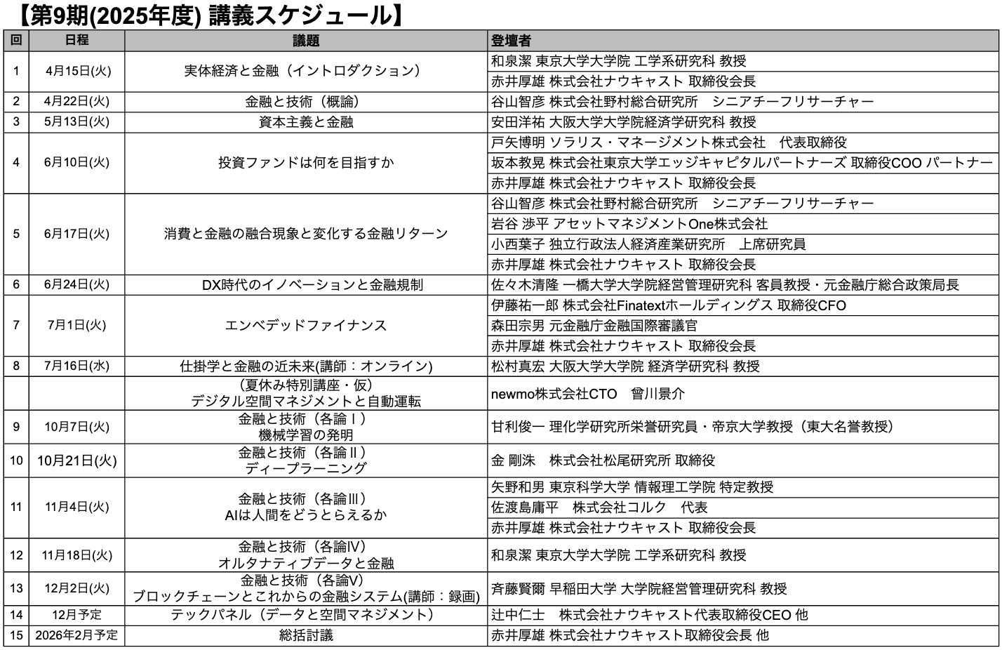 「近未来金融システム創造プログラム」は、Finatextホールディングスが近未来の金融システムを創る中核人材の育成を目的に2017年から毎年開講しているプログラムで、2025年度で9期目を迎えます。株式会社ナウキャスト取締役会長の赤井厚雄がプログラム統括責任者を務めています。