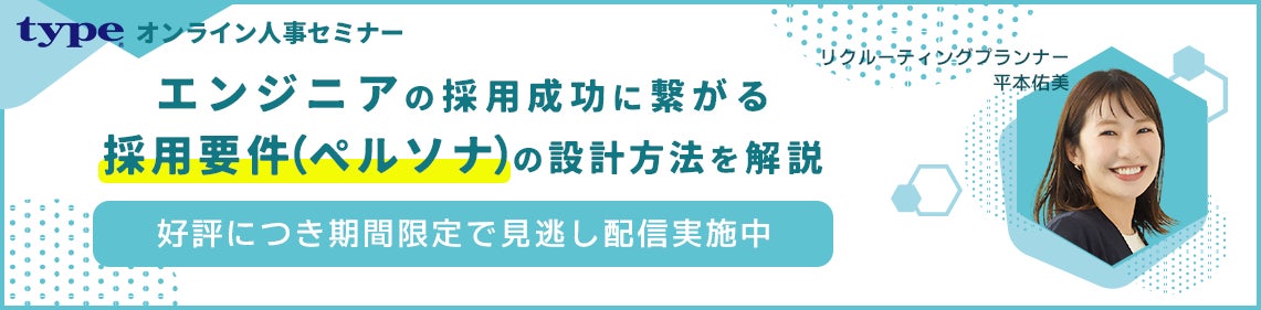 2023年3月に開催したセミナー「エンジニアの採用成功に繋がる採用要件(ペルソナ)の設計方法を解説」が好評につき、期間限定で当日の動画を公開いたしました(https://info.type.jp/webinar-guide/archive-0029/)★アンケートに回答いただいた方には、セミナーのスライド資料をお送りします