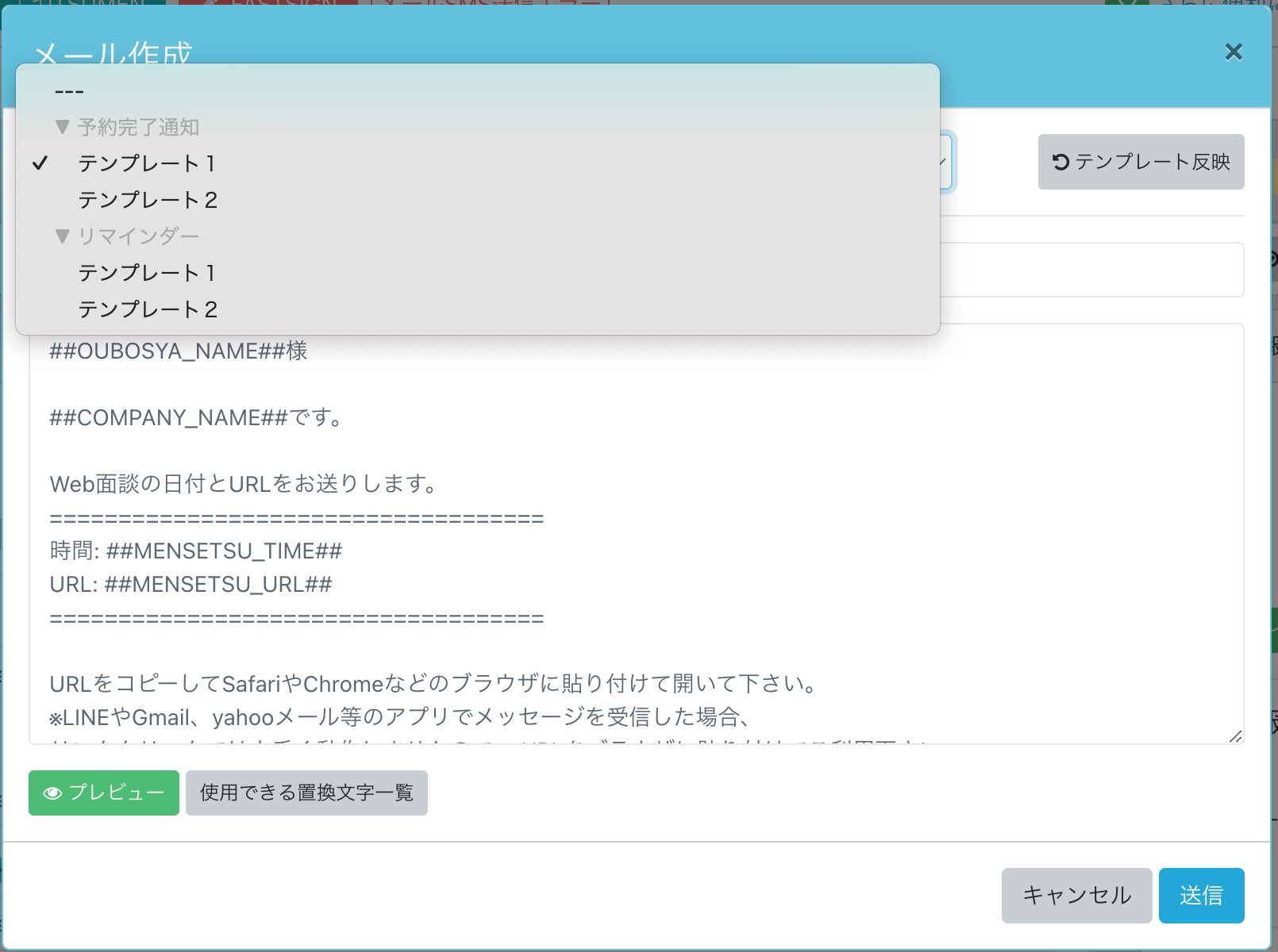 任意のタイミングで送信する際は、これまでは本文を手動で記入するか、デフォルトの面接予約時のテンプレートの引用することしかできませんでしたが、今回の機能追加でSOKUMENに設定されているすべてのメール・SMSテンプレートから選択できるようになりました。