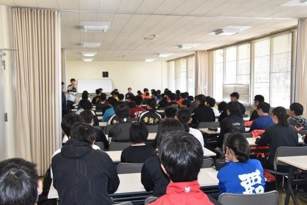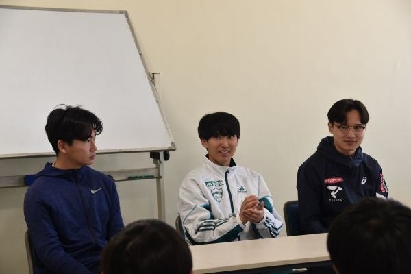 講演会では、蓑和先生が司会を務め、駅伝を始めたきっかけや目標達成のために取り組んできたこと、学生時代の思い出のレース、休みの日の過ごし方、調子が悪い時やタイムが伸びない時の対処法、今後の目標についてなど質問が多岐にわたり、あっという間に1時間以上が経過しました。2人がそれぞれ具体的な練習メニューやこれまで努力してきたことを話すと、受講生たちは目を輝かせて聞き、真剣にメモを取ったり、直接質問をしたりと、現役選手にとっては夢のような充実した時間となりました。