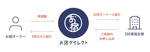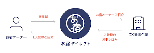 旅行サイト経由でかかる宿泊予約の手数料をなくし、宿泊施設側もお得かつダイレクトに予約受付ができる宿情報専門のポータルサイトです。掲載費無料でホテル・旅館などの施設情報を発信することができます。また、最近では利便性向上とコストダウンを同時に求められ、宿泊施設側もDigital Transformation* (DX化)することが求められています。お宿ダイレクトは、施設オーナーとDX化を推進したい企業とのマッチングも行い、宿泊DXの促進もサポートしています。