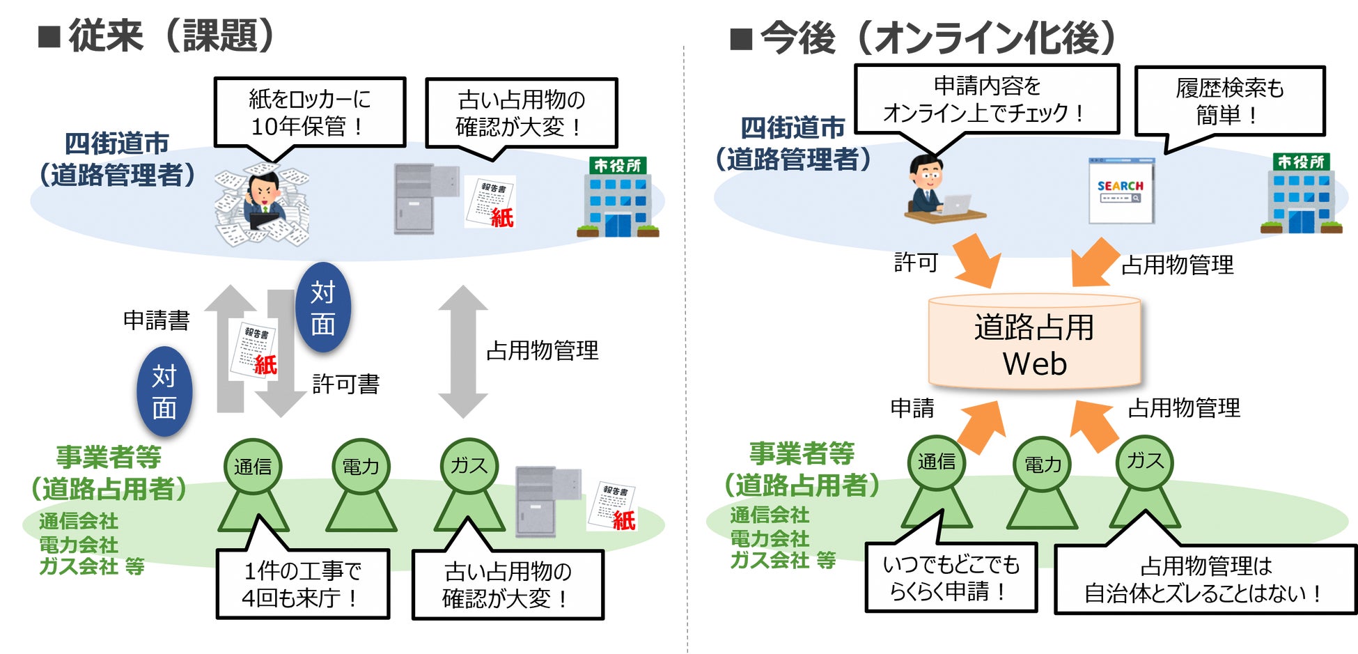 本実証において「道路占用Web」を活用したことで、行政機関の申請窓口業務における非対面化を図り、従来の申請受付における時間的な制約や申請書類の記載不備などにより事業者が複数回にわたって来庁する必要性が解消したほか、ペーパレス化及び申請許可情報の一元管理と進捗の見える化などにつながり、その効果を確認することができたことから、今回、四街道市において本格的に運用することとなりました。