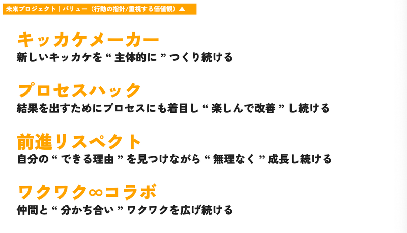 バリュー「キッカケメーカー」「プロセスハック」「前進リスペクト」「ワクワク∞コラボ」
