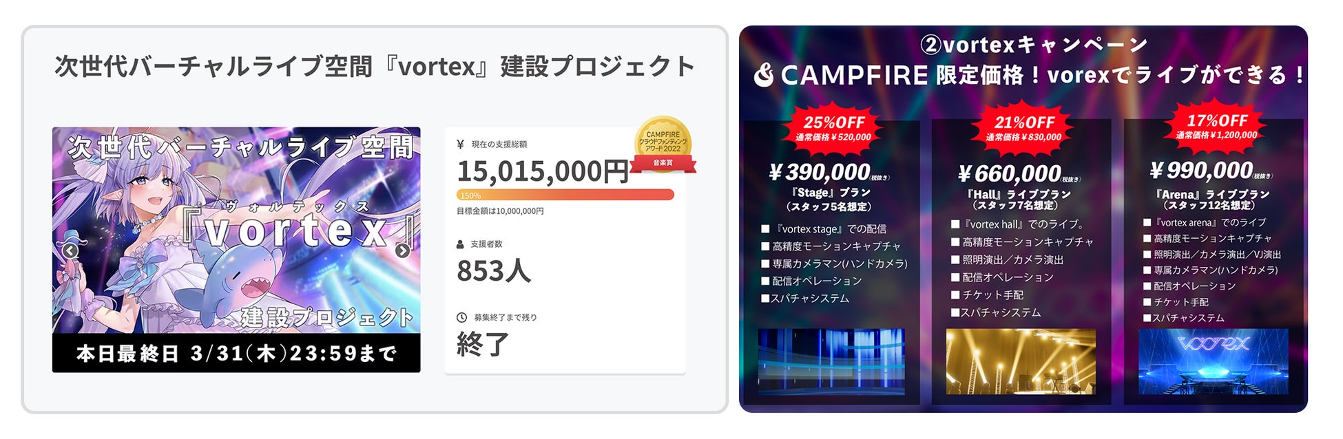また、バーチャルライブ制作システム「vortex」を、CAMPFIRE特別料金で利用できるスペシャルプランをご用意。バーチャルライブ開催を目指す全ての活動者のサポートメニューとして提供開始いたします。