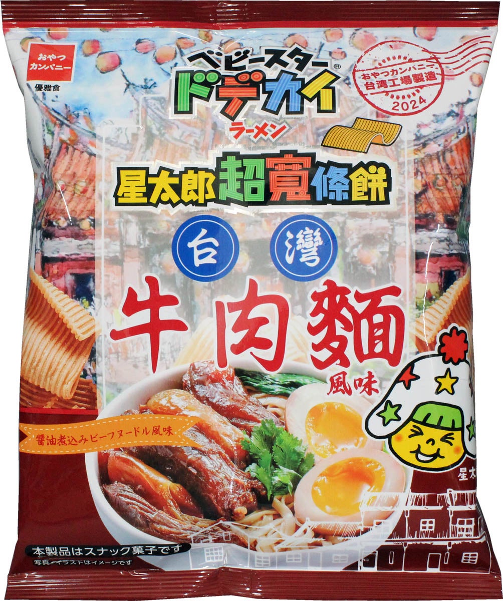 株式会社おやつカンパニー(本社所在地:三重県津市 代表取締役社長:横山正志)は、台湾・桃園市のおやつカンパニー台湾工場で製造した台湾現地で最もポピュラーな麺料理“牛肉麺(ニュウロウミエン)”風味の『ベビースタードデカイラーメン(台湾牛肉麺風味)』を逆輸入し、2024年5月13日(月)より全国にて発売します。