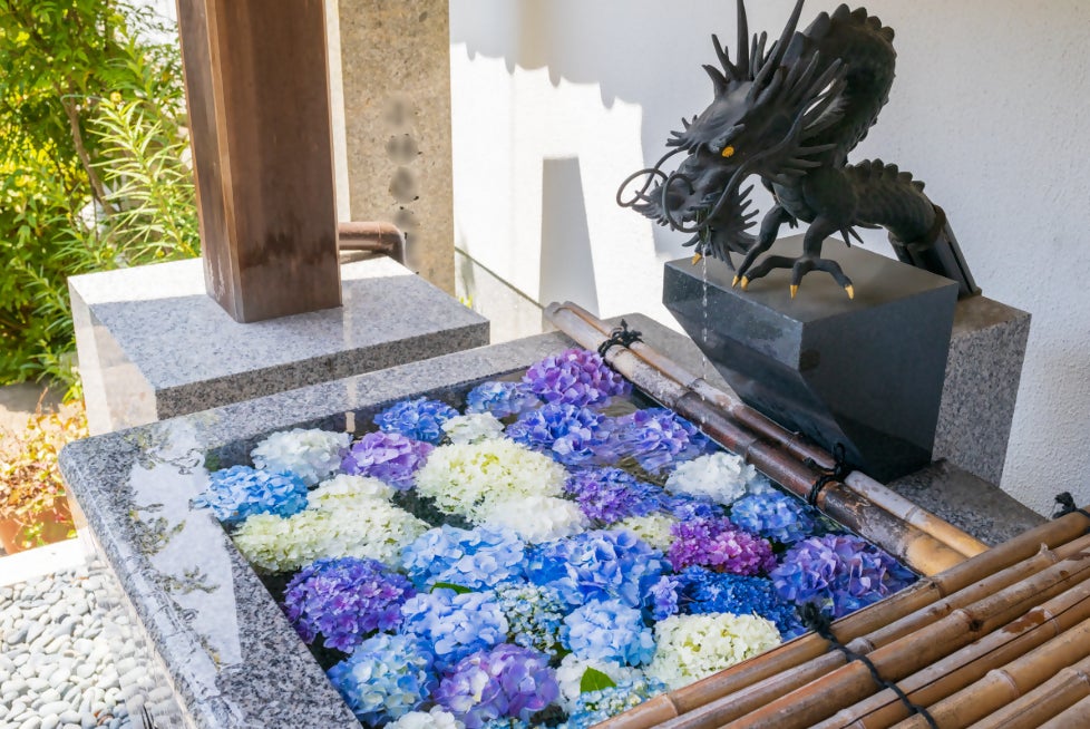 奈良時代に開かれた歴史ある寺院の静寂な空気と、石灯籠や境内の滝を背景に咲き誇るあじさいは神秘的な雰囲気を漂わせます。手水鉢にあじさいを浮かべた「花手水(はなちょうず)」は、訪れる人々の心を掴む“フォトジェニックなスポット”です。