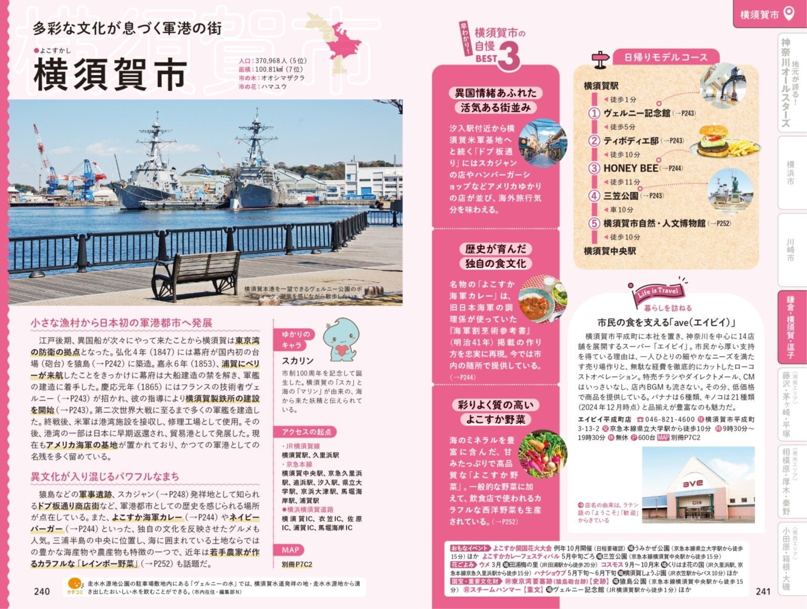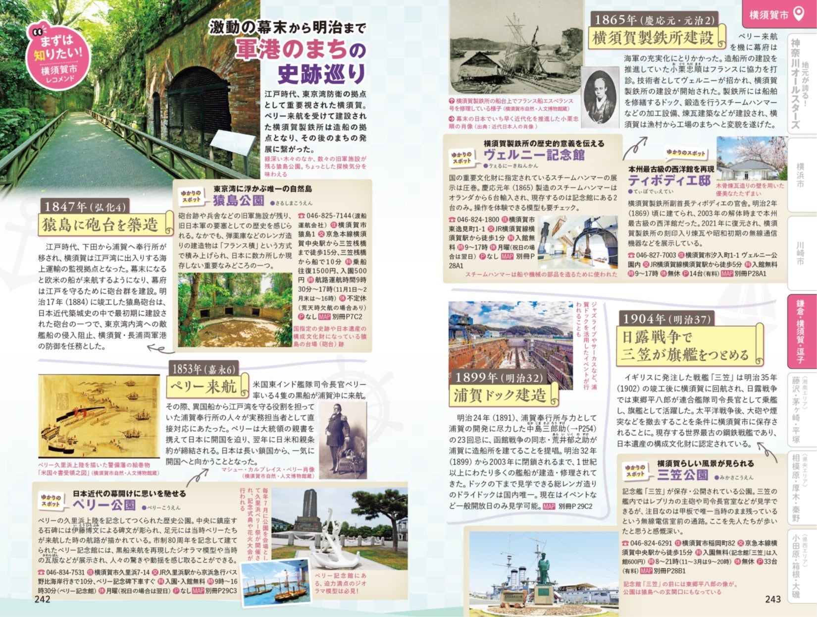 中を開けば、神奈川県33市町村・横浜市18区・川崎市7区・相模原市3区、すべてのまちごとに、まずは知ってほしい、一番おすすめの情報を特集しているほか、みどころ・グルメ・ショップ・イベントなどなど、徹底してよりすぐった施設を多数掲載しました。まさに、神奈川の大事典となっています。