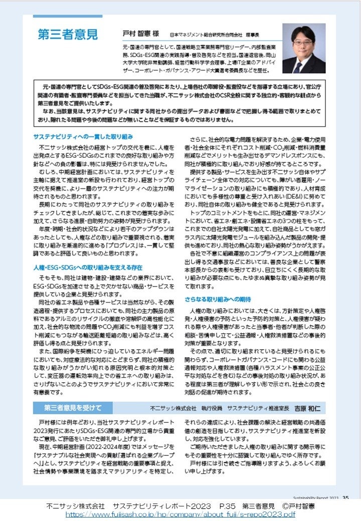 企業のサステナビリティ・ESG・SDGs・人権・コンプライアンス等について、弊社理事長の戸村智憲が中立公正な観点から第三者意見書をご提供しておりますが、今年も不二サッシ(株)におきまして、サステナビリティレポートで下記の通り第三者意見をご提供致しました。