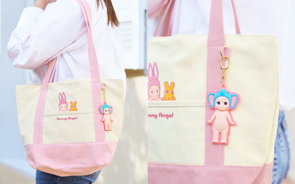 Sonny AngelとRobby Angelが、ポケットに入ってあなたとお出かけをしているようなデザインのトートバッグ。ピンクとベージュの落ち着いたくすみカラーに、A4サイズのノートがすっぽり入る使いやすいサイズ感で、日常使いにぴったりです。