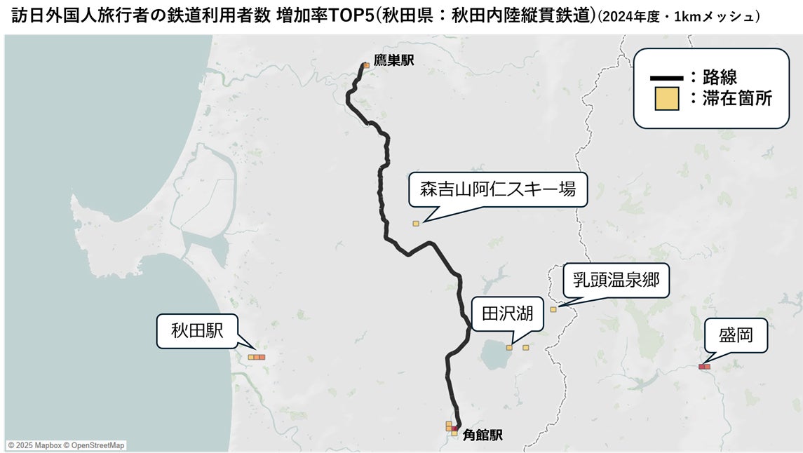 秋田内陸縦貫鉄道の利用者について、当日の滞在エリアを確認すると、日本三大樹氷の一つ「森吉山の樹氷」で知られる森吉山阿仁スキー場や、田沢湖、乳頭温泉郷での滞在が確認されました。秋田内陸縦貫鉄道によると、「県全体でインバウンド向けのプロモーションは20年以上行ってきた。コロナ禍前頃から個人旅行客の誘致に力を入れてきた。阿仁スキー場は今年特に欧米系の方に人気だったように思う」とありました。