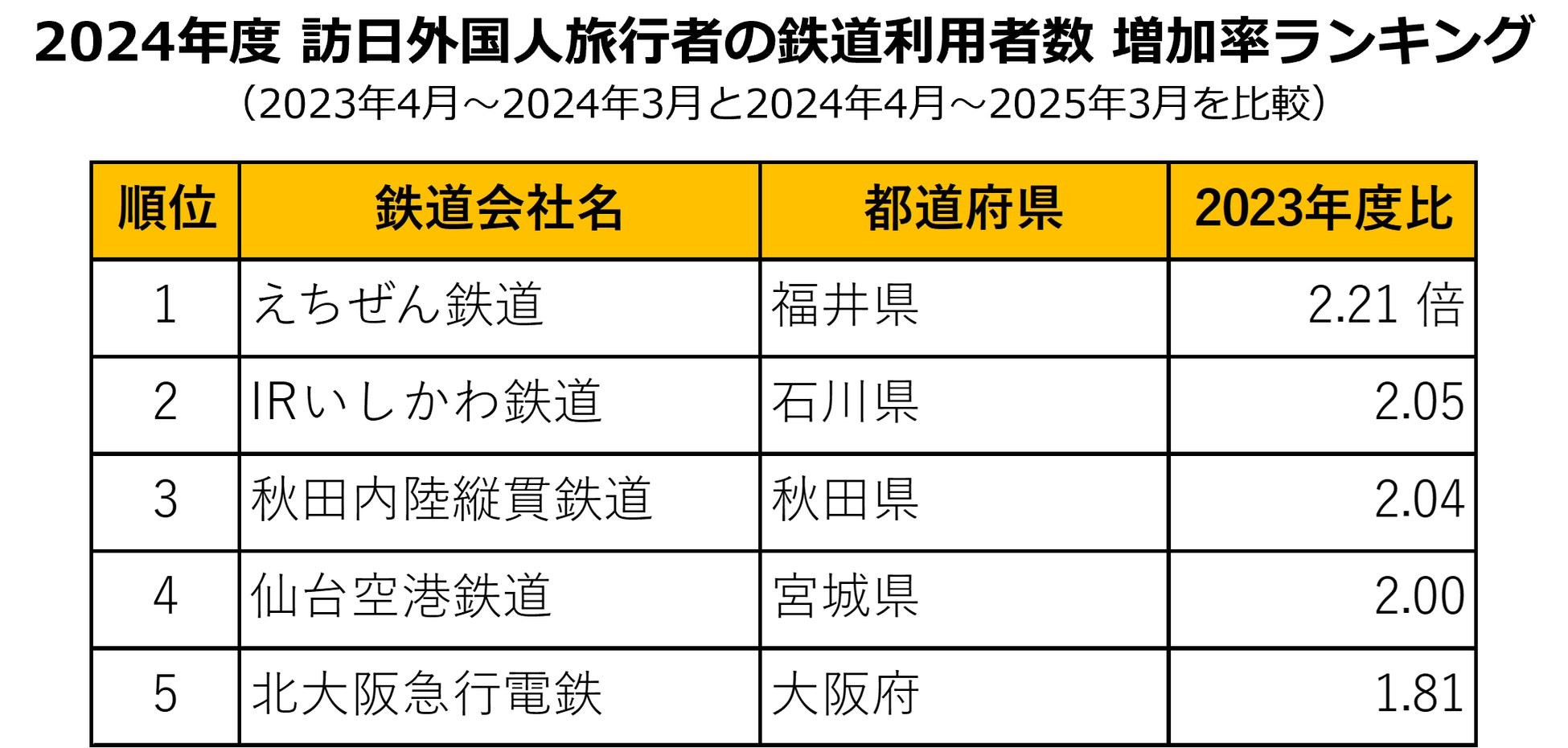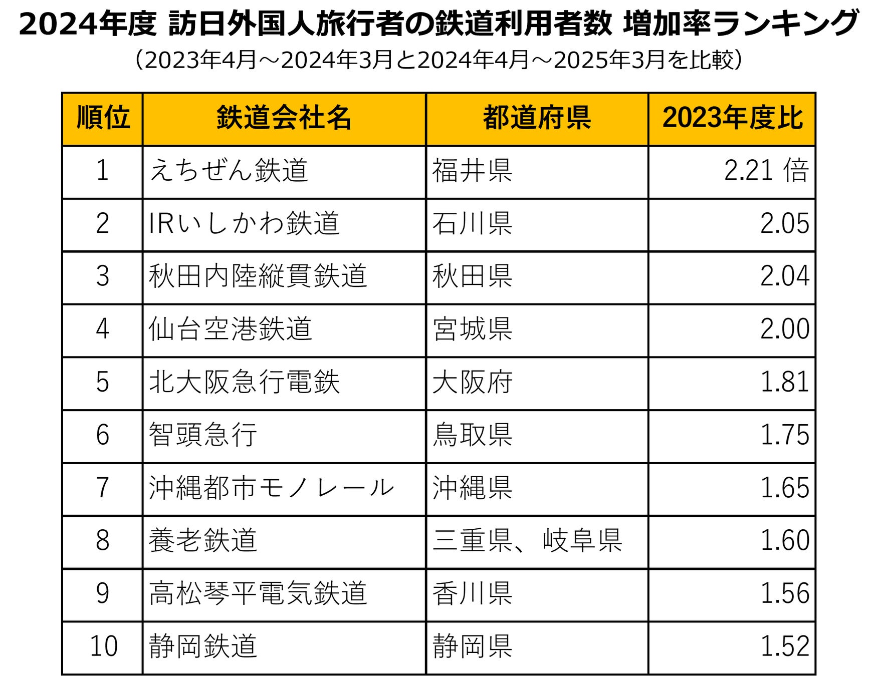 トップのえちぜん鉄道は、2023年度利用者数の2.21倍の増加、続くIRいしかわ鉄道は2.05倍の増加となりました。いずれも北陸地域で運行する鉄道であり、2024年3月の北陸新幹線延伸が主な要因と考えられます。3位の秋田内陸縦貫鉄道は2.04倍、4位の仙台空港鉄道は2.00倍となり、冬の東北への旅行需要の高まりによる利用者数の増加がうかがえます。5位の北大阪急行電鉄は1.81倍で、2024年3月の延伸開業が影響したとみられます。