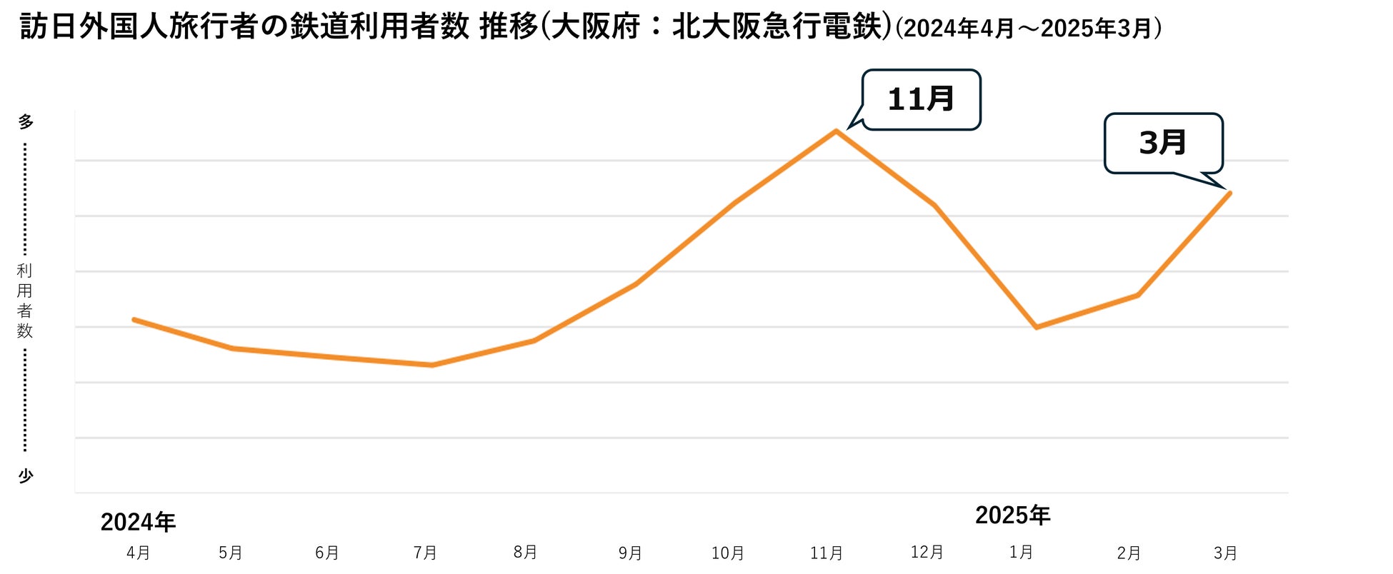 北大阪急行電鉄の月別利用者数の推移を確認すると、11月と3月にピークを迎えており、紅葉や桜のシーズンに多くの来訪があったことがうかがえます。