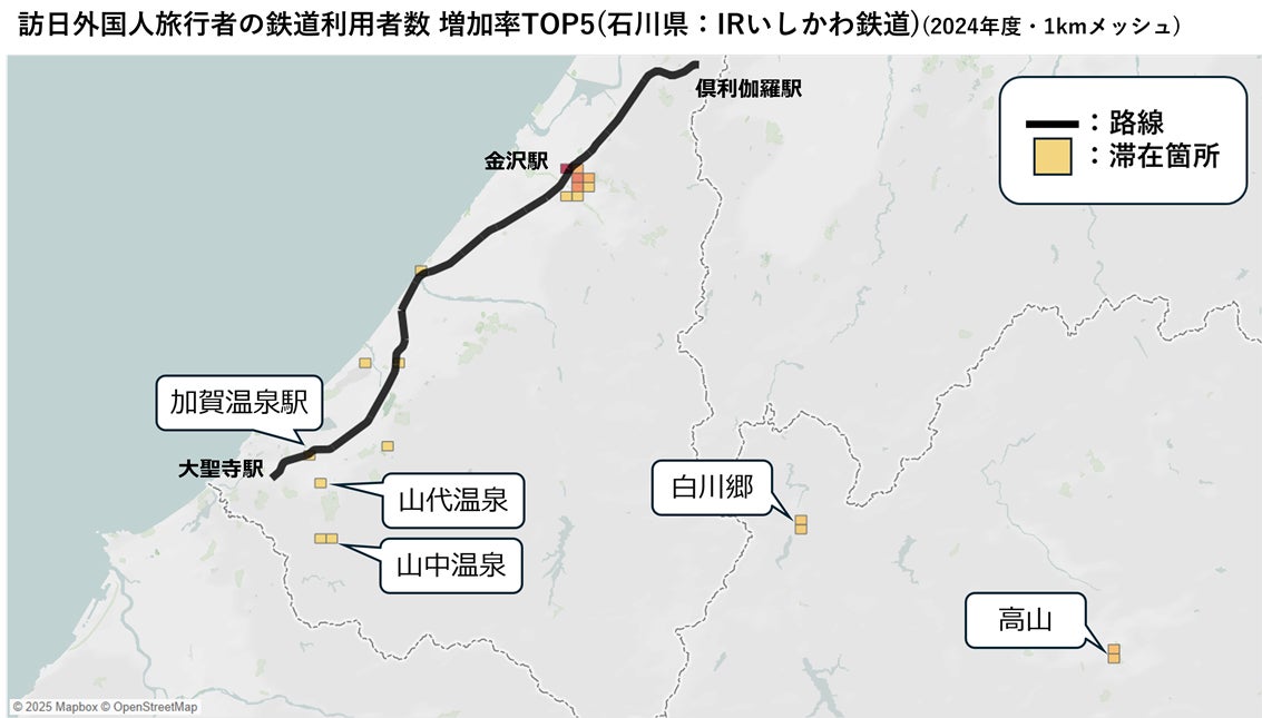 IRいしかわ鉄道の利用者について、当日の滞在エリアを確認すると、加賀温泉駅を最寄りとする加賀温泉や、山代温泉、山中温泉での滞在が多く見られました。白川郷や高山での滞在も確認され、地域別では、欧州からの来訪が特に多い傾向にあります。
