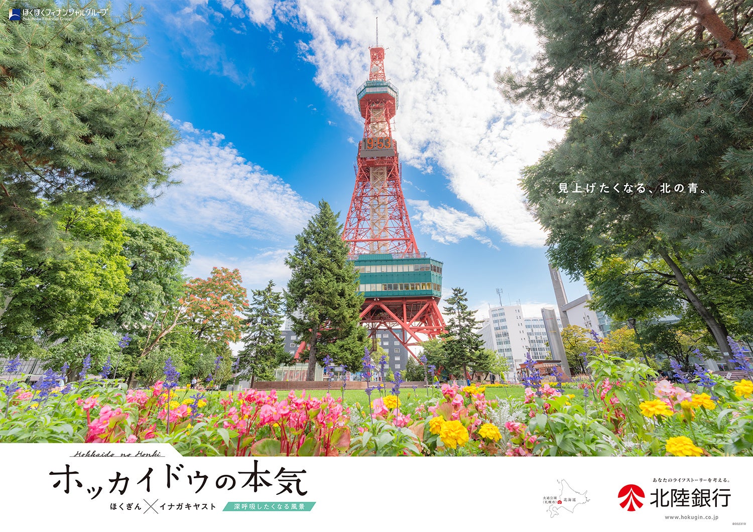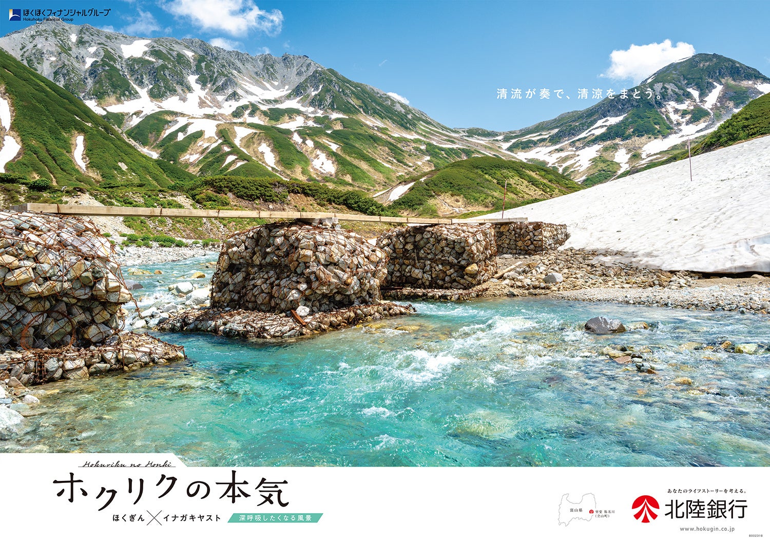 2024年度は新たに「深呼吸したくなる風景」というテーマのもと、各県で撮影した作品を北陸銀行ポスター等の広告媒体で発信します。今回は富山県の「称名川」と北海道の「大通公園」の2点です。清流にかけられた橋を渡ってみたくなるような、冷たい水しぶきと澄んだ空気を感じる作品と、花や木々に彩られた北海道の短い夏の爽やかさを感じる作品です。