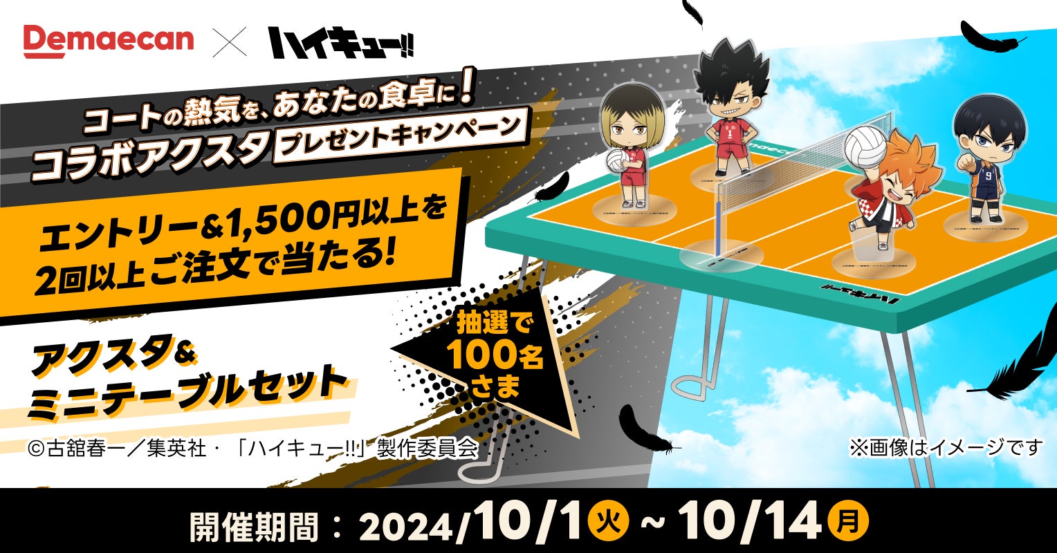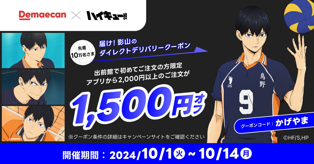 株式会社出前館が運営する日本最大級のデリバリーサービス『出前館』は、アニメ「ハイキュー!!」とのコラボキャンペーン「“食”よ届け いざ頂へ」の第3弾を、2024年10月1日(火)から開催いたします。
