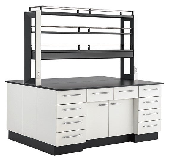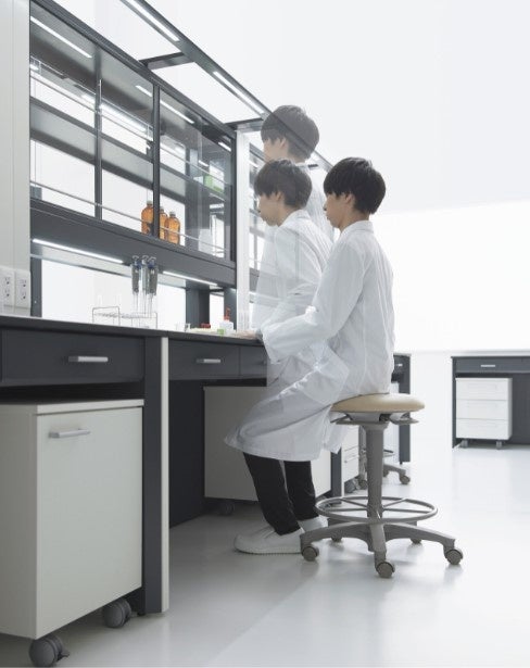 ・実験台の「シェルフの照明の光源が視界に入る」「天板下の引出に足をぶつける」など、立ち座り動作の繰り返しから発生するストレスを、MAGBITでは、シェルフの下部照明の直接光が目に当たらない構造にすることで不快な眩しさを発生しにくくしました。また、天板下引出の下部にスラントしたディテールを設け、足当たりの不快感を軽減しました。