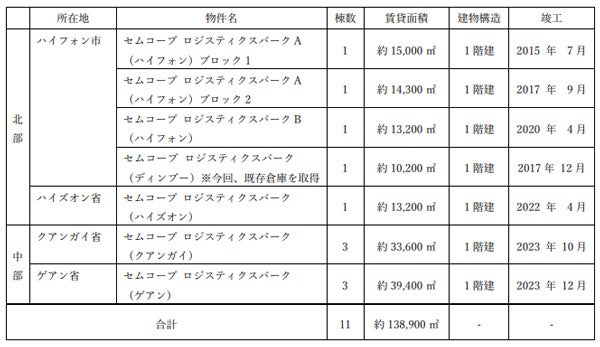 今般、その一環として、ベトナム北部のディンブー工業団地内において、既に稼働中の倉庫1棟(賃貸面積約1万平方メートル)を有する物流倉庫用地を取得するとともに、同一敷地内に新たに5棟の倉庫を建設する開発プロジェクト「セムコープ ロジスティクスパーク(ディンブー)」に着手しましたので、お知らせします。