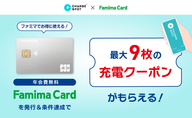 ファミマカードの新規発行および利用条件の達成に応じて、CHARGESPOTで使えるクーポンを最大9枚プレゼントいたします。