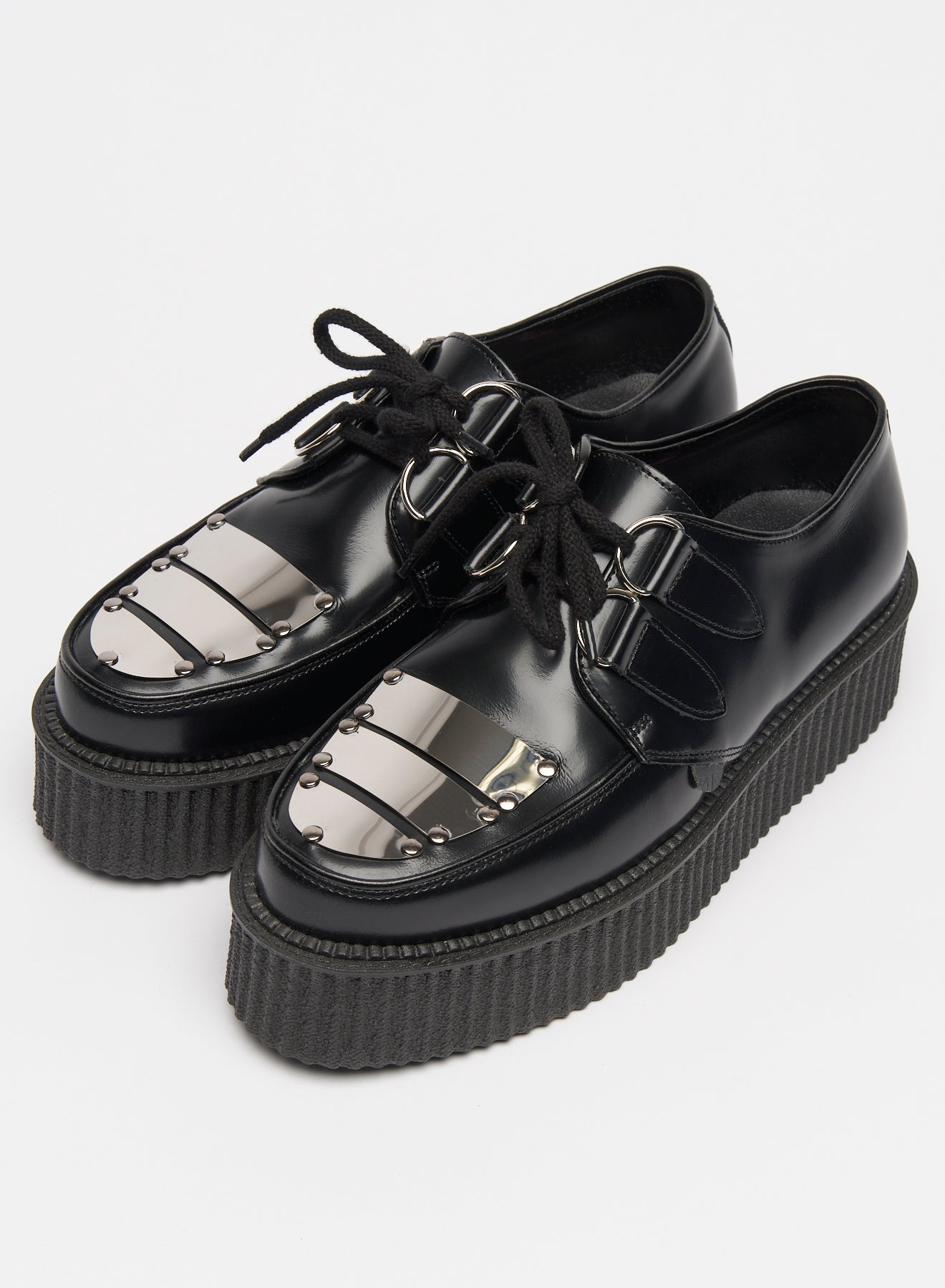 山本里美が手がけるLIMI feuとイギリスのシューズブランドUNDERGROUND® との初コラボレーションシューズ。UKロックとパンクにインスピレーションを得たUNDERGROUND® のアイコニックモデルであるウルフルン・クリーパーシューズをベースに、メタルプレートをトゥ・フロントに打ち付けたパンキッシュなアッパーデザインがポイント。LIMI feuらしい揺るぎない反骨の姿勢を感じさせる。