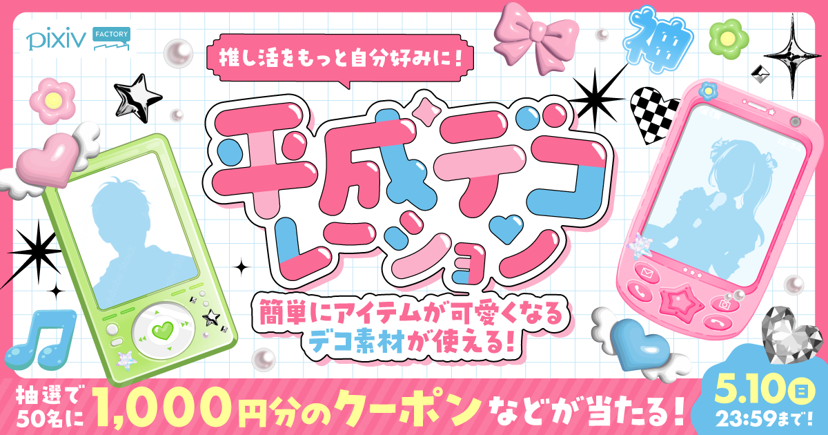 ピクシブ株式会社(本社:東京都渋谷区、代表取締役CEO:丹羽 康弘、以下ピクシブ)が運営する、ものづくりがもっと楽しくなるグッズ制作サービス「pixivFACTORY」は、自分だけの「平成かわいい」推し活アイテムがつくれるデコ素材の提供を4月22日(水)より開始します。さらに本機能のリリースを記念し、平成風デコ素材を使用してデザインしたグッズを保存すると、抽選で1,000円分のクーポンや限定アイテムなどが当たるキャンペーンを実施します。