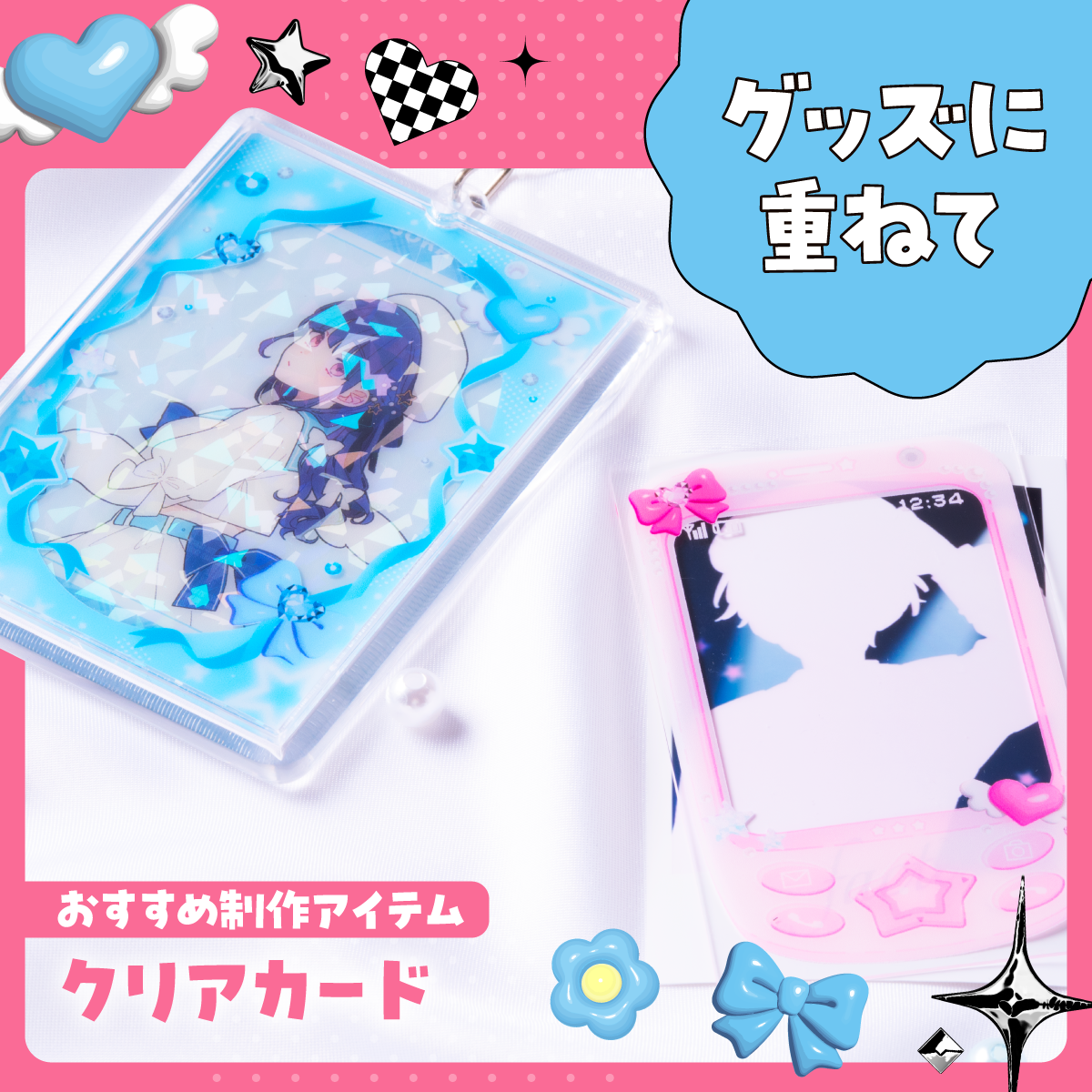 ①クリアカード: 推しのブロマイドに重ねて「透かしデコ」を楽しめます。