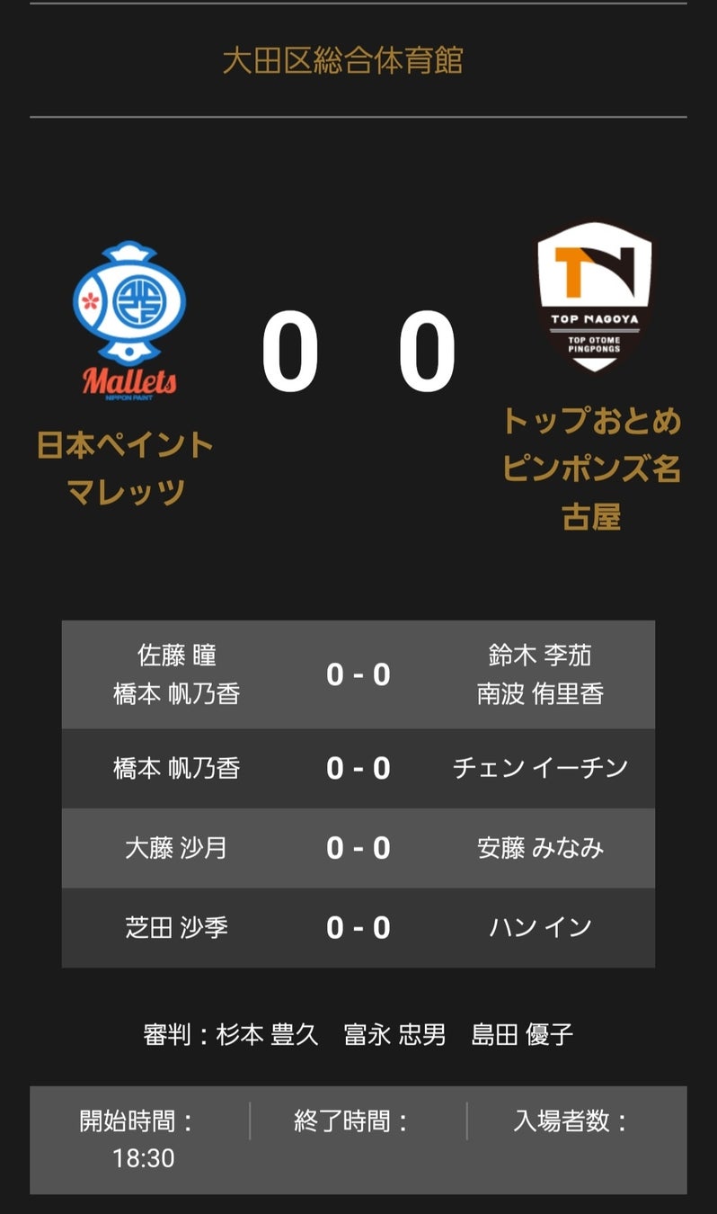 ノジマTリーグ 2022-2023シーズン 公式戦 9月16日開催 大田区総合体育館 日本ペイントマレッツ vs トップおとめピンポンズ名古屋 対戦オーダーが発表されました