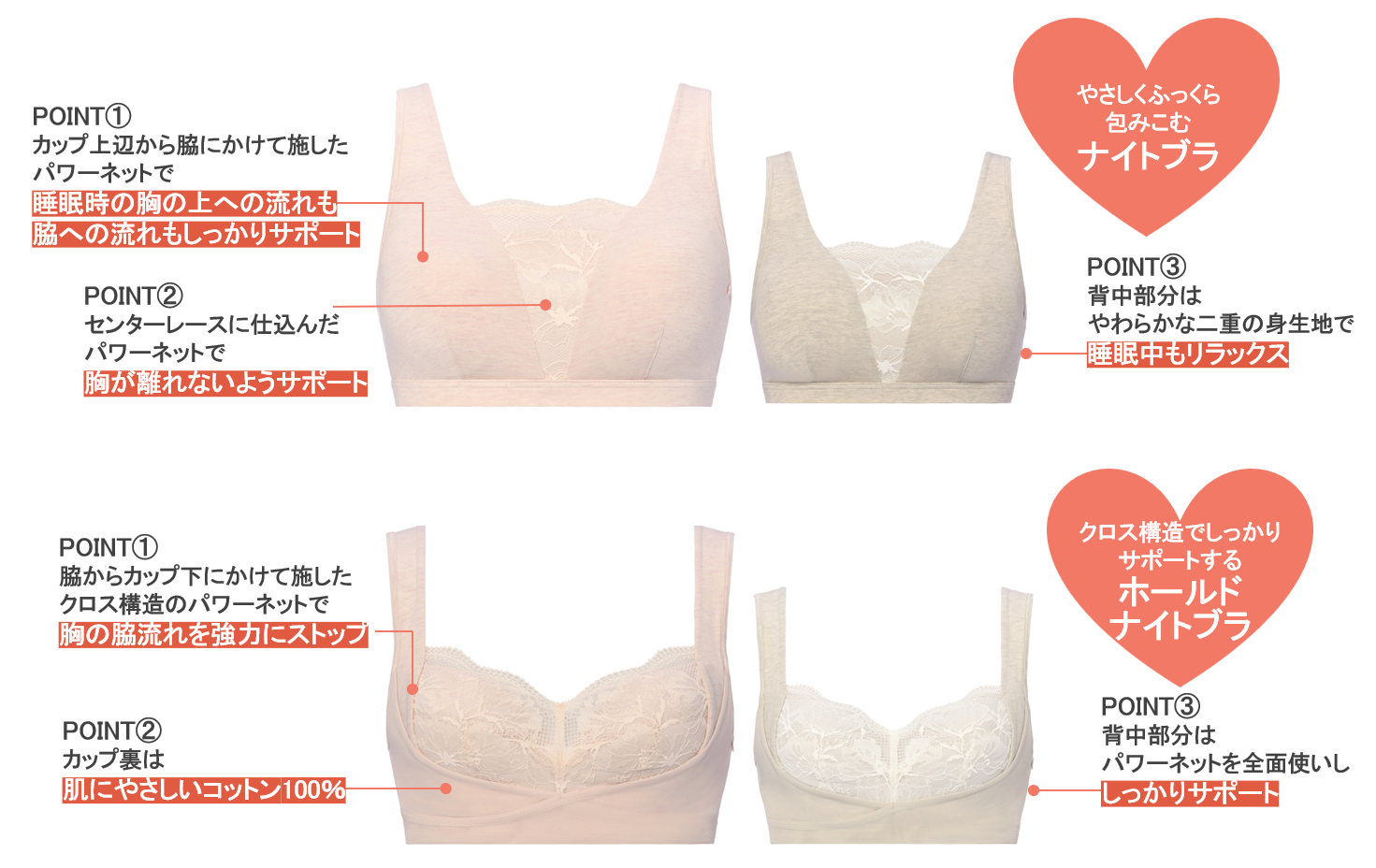 クロス構造でしっかりサポートする「ホールドナイトブラ」がラインアップ
